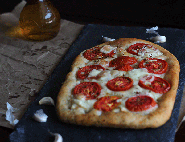 Place the cheese slices and tomato slices on top of the bread after 30 minutes and bake at 180 degrees for 40 minutes. You can also sprinkle some herbs before baking though the dough already has sufficient herbs.