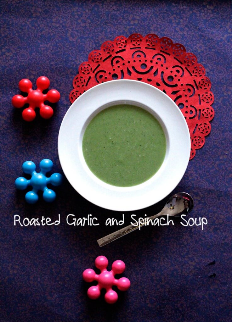 I am planning to do the toddler recipes one by one instead of two’s. I have backlogs of recipes in this series that haven’t been posted for months but I will continue till they reach 365th day. I am going to post the regular recipes on the same day too so there could be days when you will find more than one recipe on this space hope you will find time to read them all. And here’s the recipe for roasted garlic and spinach soup.